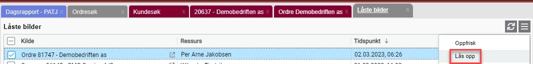 Det kan selvfølgelig skje at en bruker forlater arbeidsplassen sin med en låst ordre uten at han egentlig hadde tenkt å redigere noe. Man kan da tvangsåpne denne i menyen Annet/Låste bilder. Bruk denne funksjonen varsomt.